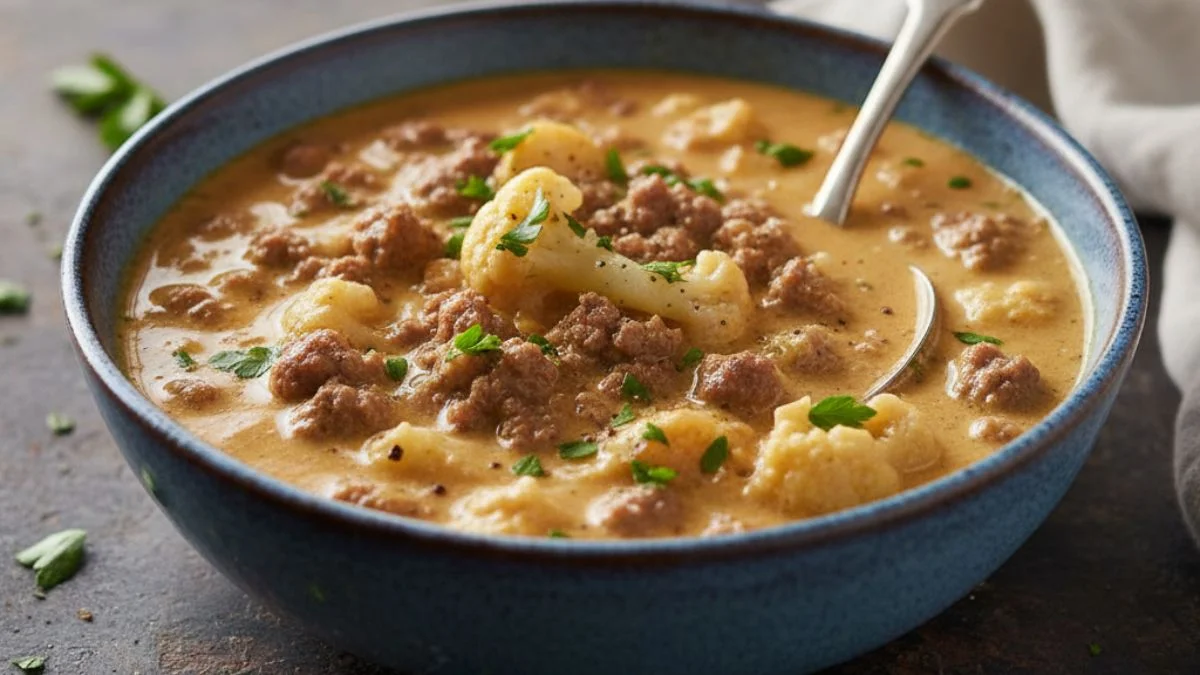 This Keto Cauliflower & Hamburger Soup is creamy, low-carb, and packed with flavor—perfect for a warm, hearty, and healthy comfort meal the whole family will love!