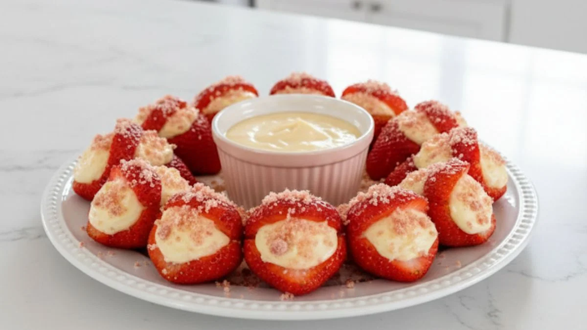 Wash and dry the strawberries thoroughly. Slice each berry in half lengthwise. Using a small spoon or knife, gently hollow out the center to create space for the cheesecake filling. Set aside.
